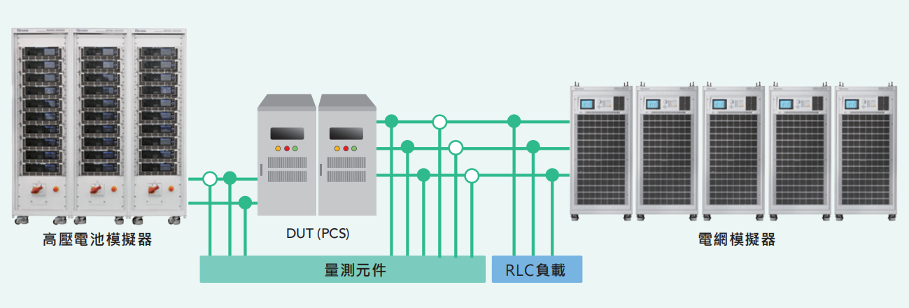 储能变流器(PCS)为连接于电池系统与电网之间可实现电能双向转换的装置,其直流端电池电压范围从450V~1500V高压趋势发展,此装置具有充放电功能、有功功率控制、无功功率调节和并离网切换。使用者常困扰如何准备实际高压电池测试此PCS于充放电转态(规格一般<100ms)性能,且无法快速可重覆性、控制性、安全性使用研发验证及生产,62000D具有高压62180D-1800(1800V/40A/18kW)机种可并联达540kW/1800V/1200A,以取代真实电池模拟为一台电源或一台能源回馈负载进行此充放电转态性能于连续电流不中断。