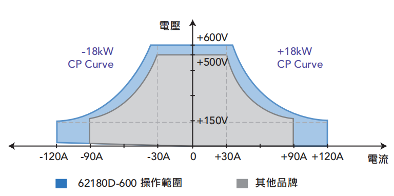 62000D双向直流电源提供宽广的4倍操作范围。型号62180D-600的输出规格为18kW/600V/120A可于不同的组合中灵活操作如图所示。相较竞争者直流电源的输出范围为3倍,62000D于低电压时提供较大的电流。这表示低电压/高电流及高电压/低电流两者的待测物可使用此单台直流电源供应器测试涵盖更广,于一般的ATE系统及实验桌使用时可取代多台直流电源供应器以节省成本与空间。