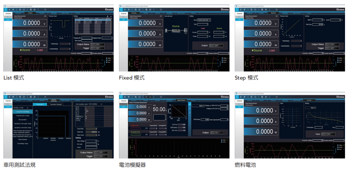 62000D系列双向直流电源具有100步骤可编程设定,使用者可透过List Mode自定义编辑所需输出波形,且62000D系列并具有高斜率控制,可满足许多测试需求,例如部分新能源汽车零部件测试法规LV123、LV148等测项所需,搭配Chroma Softpanel软件界面,使用者更可一键操作输出测试。