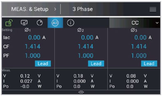 63800R系列能源回收式交流电子负载配备触控式操作萤幕,提供直观的UI介面让用户快速进行多项设定和操作。交流负载的进阶功能如拉载/卸载角度、拉载电流Slew Rate等设定,皆隐藏于右上角More Setting功能,使主设定画面简洁干净。而透过全屏模式,可将所有量测值扩展至全屏,适用于完成输入设定后的观察环节,提供用户更清楚的量测参数画面。