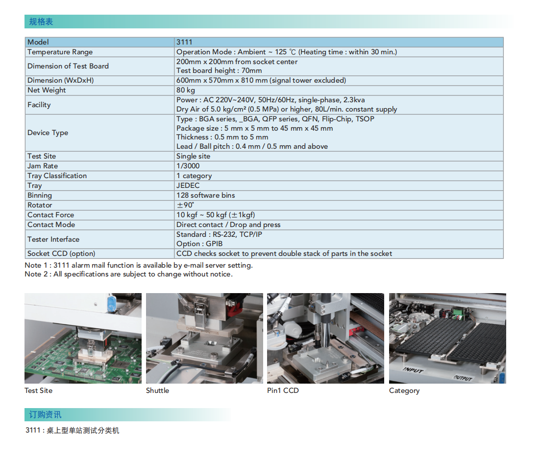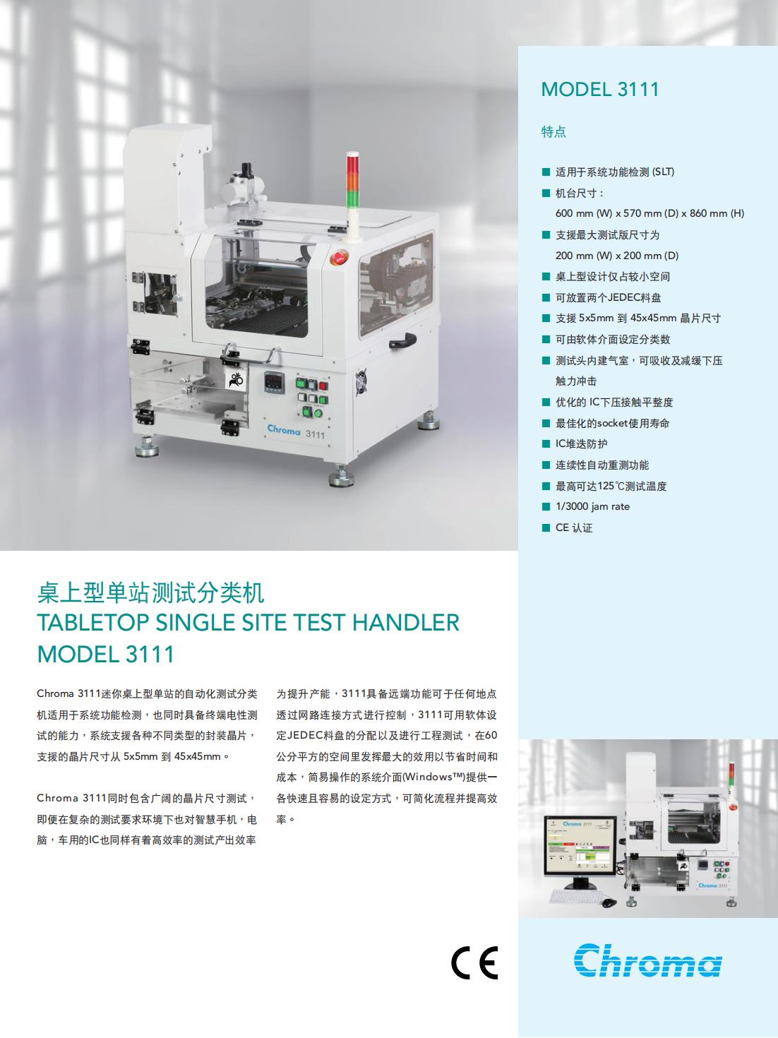 Chroma 3111迷你桌上型单站的自动化测试分类机适用于系统功能检测,也同时具备终端电性测试的能力,系统支援各种不同类型的封装晶片,支援的晶片尺寸从5x5mm到45x45mm。