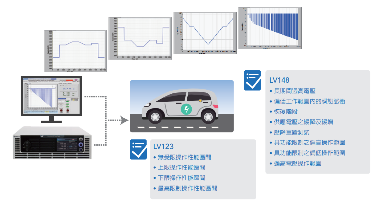 因应全球节约能源之趋势以及降低碳排放的走向,各车厂也纷纷发表未来世代新能源汽车的技术发展及标准规范,定义各种类型的电动车辆测试,其中LV123所标定之车内高压系统之部件测试,以及LV148所标定之48V电池电压系统之部件测试。62000D双向直流电源具有高速CV动态响应斜率可控制最高达180V/ms,此可应用于许多汽车法规之电器特性测试,搭配Chroma Softpanel软件,使用者更可一键操作输出测试。