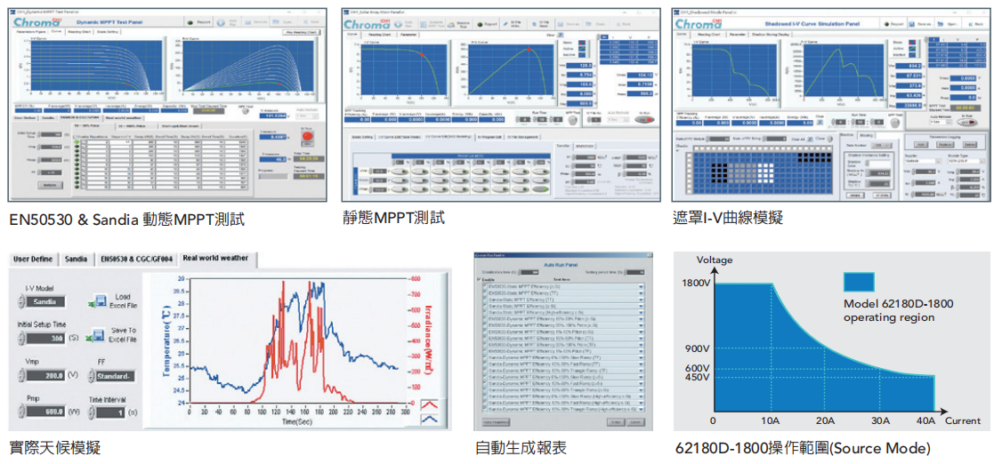 62180D-1800机型具选配太阳电池数组模拟功能,于单机内置EN50530 & Sandia的SAS模型方便使用者透过前面板操作或远端控制整合使用,软体具有静态及动态最大功率点追踪(MPPT)测试、掩码I-V曲线模拟、实际天候的I-V曲线变化测试、自动程序静态&动态MPPT性能测试及自动生成报表于Excel表格内,以上非常适合验证组串式光伏逆变器性能。另外,62180D-1800(1800V/40A/18kW)机种可支持主/从并联30台,输出规格达540kW/ 1800V/ 1200A以调节于高压1500V商业(15-100kW)组串式逆变器及分布式发电站用(150-500kW)逆变器测试使用。