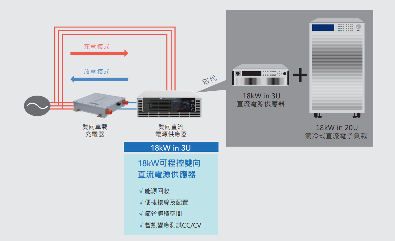 随着电动汽车的普及,因此OBC车载充电器朝V2G(Vehicle to Grid)、V2L(Vehicle to Load)及V2H(Vehicle to Home)通过双向充放电与电网进行运行管理。62000D系列双向直流电源亦提供纯电子负载模式,有定电压(CV)/定电流(CC)/定功率(CP)模式,提供于车载充电器研发及测试时,模拟电池充电行为,仅需一台62000D即可满足双向充电器的充电及放电测试,取代传统方式需要一台直流电源搭配一台电子负载两种设备。