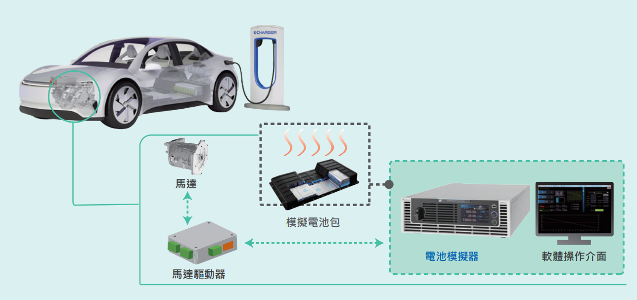 电池电量(SOC)条件或加载特定的电池特性V-I曲线,进行评价测试待测物(电力转换装置)做充电或放电的电池模拟使用,适用于车载充电器、储能装置或马达驱动器等产品测试。