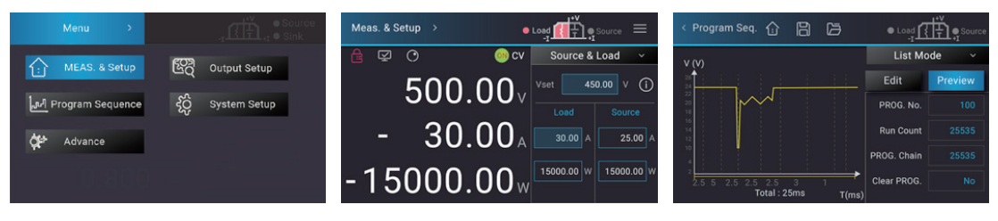 62000D双向直流电源具有新一代人机控制界面,搭配直观触控屏幕并设计友善的使用者界面,使用者可轻松的以类似操作智慧手机行为习惯来操作仪器,透过触控屏幕内icon可完成所有电压/电流的设定及测量、Program Sequence控制设定并预览输出波形等,具智慧及便捷的使用者界面。
