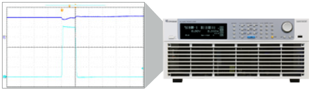 定阻抗拉载模式不同于定电流及定功率的拉载方式,定阻抗模式亦即仿真实际的感抗、阻抗、容抗与负载来进行拉载,因此,拉载电流更能趋近真实情况。此波形图为模拟交换式电源供应器于容性负载开机测试的电压、电流波形。