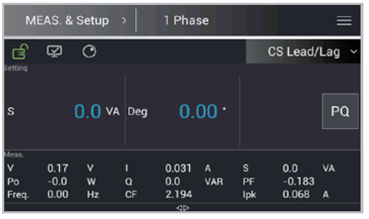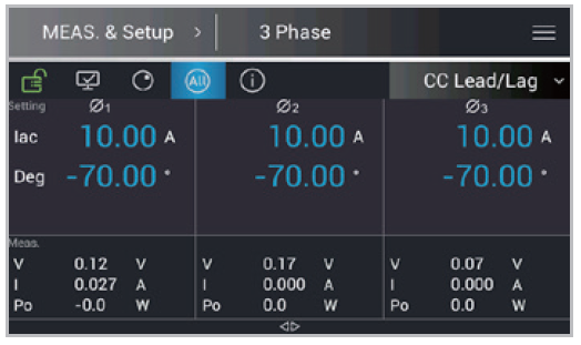 现实中许多用电设备因使用被动元件而呈现电感性或电容性,其特性为拉载电流会超前或落后电压,于此Chroma 63800R系列可藉由特定的CC Lead/Lag 和CS Lead /Lag模式,在定电流或定视在功率的测试条件下,调整电流与电压的相位差(Deg)以模拟各类型的电感性或电容性负载特性。