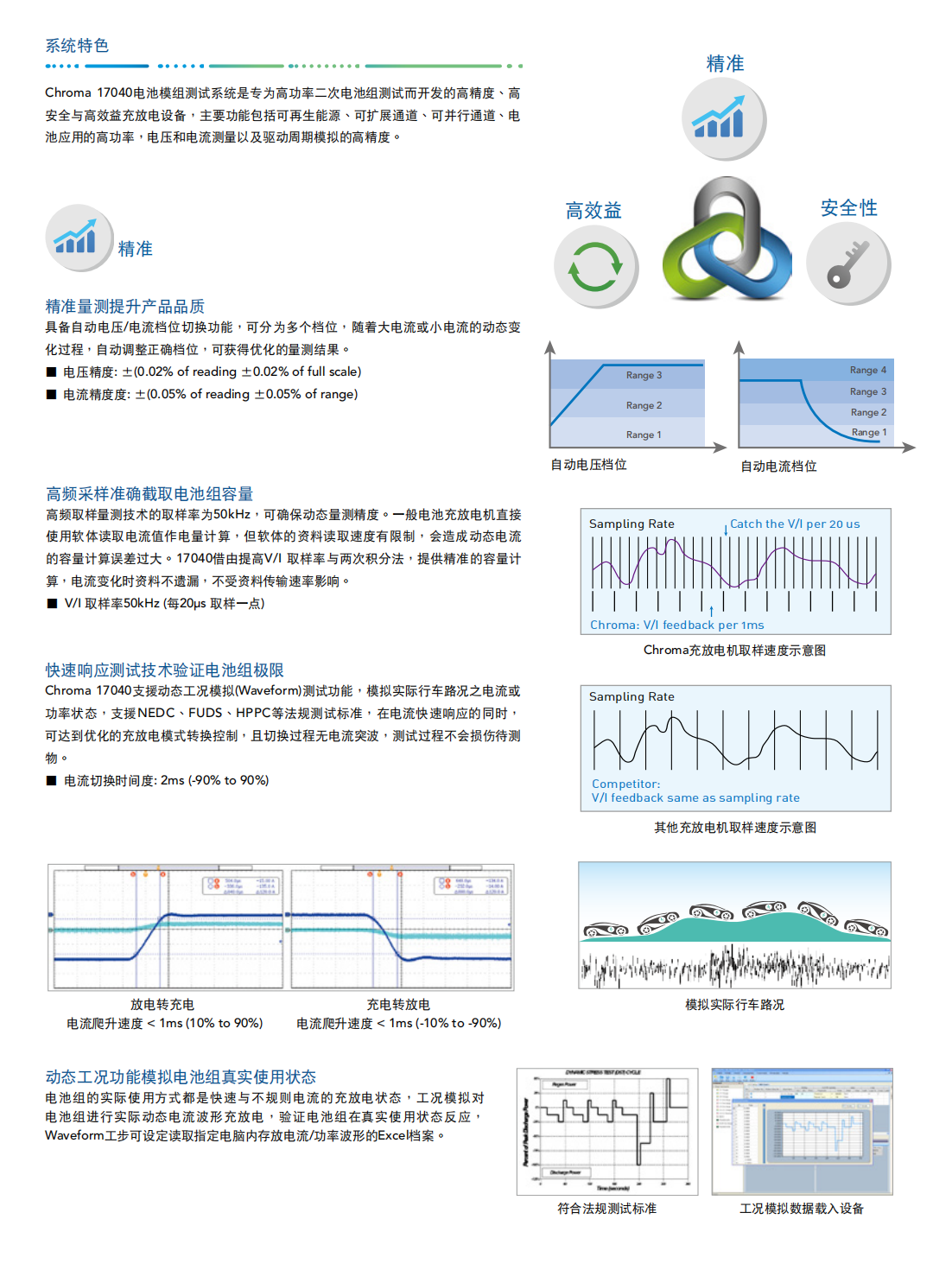Chroma 17040电池模组测试系统是专为高功率二次电池组测试而开发的高精密充放电设备,具有能源回收功能,可节省放电过程所消耗的大量电能,即使动态充放电,也能确保电网端维持稳定,不致因谐波污染影响其他设备。