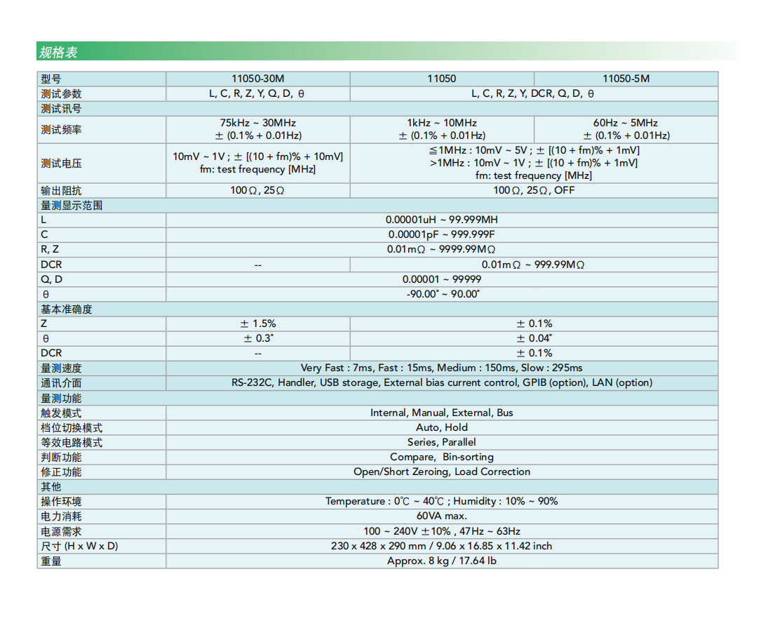 Chroma 11050系列高频LCR表为一提供被动元件量测评估解决方案,兼具精准与快速两大特色的精密测试仪器。量测项目涵盖电感、电容、电阻、品质因素、损耗因素等各种被动元件测试所需的主、副参数。