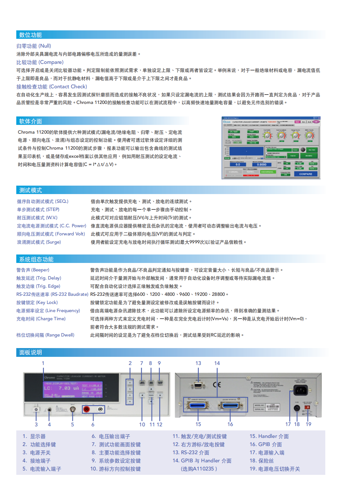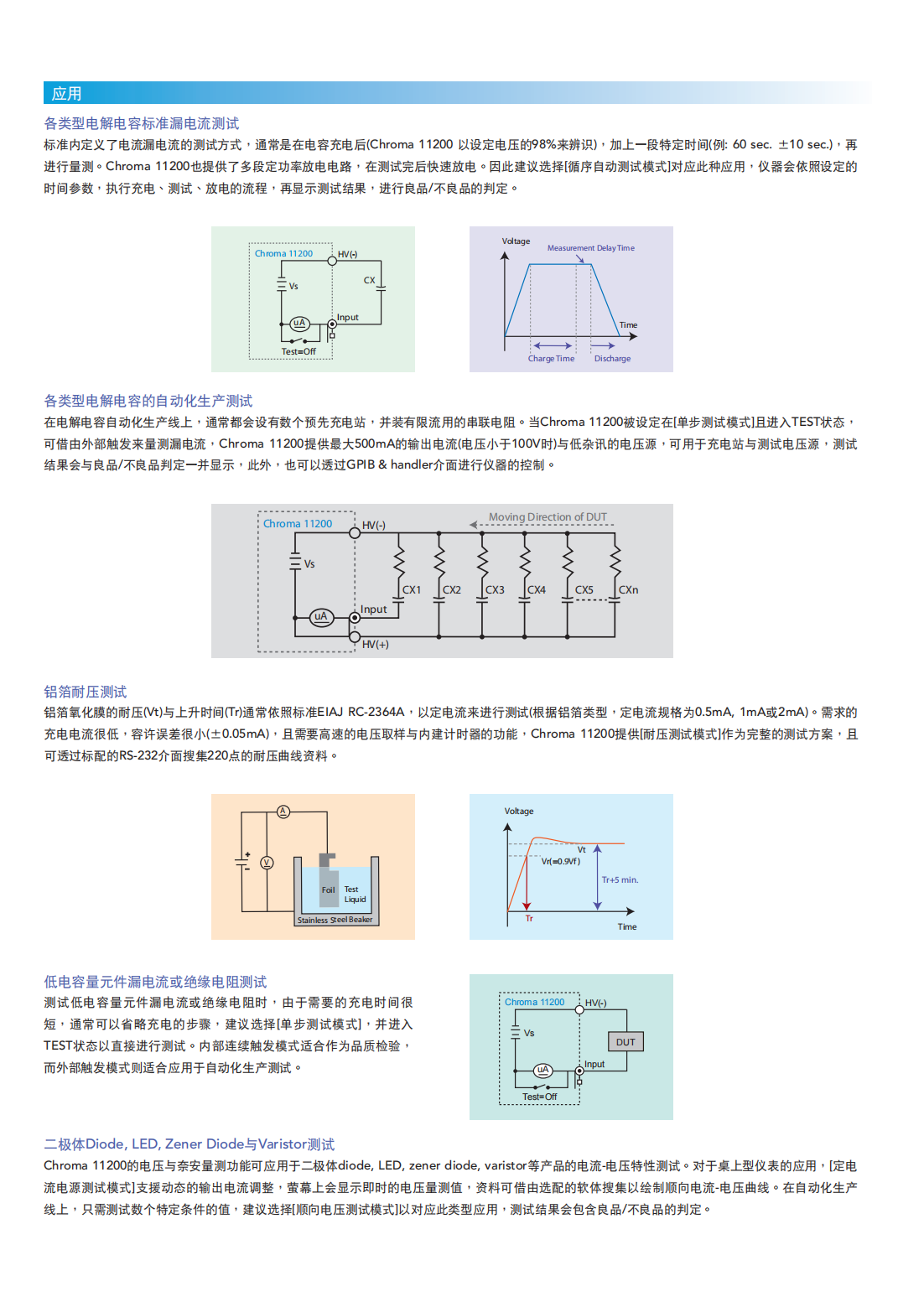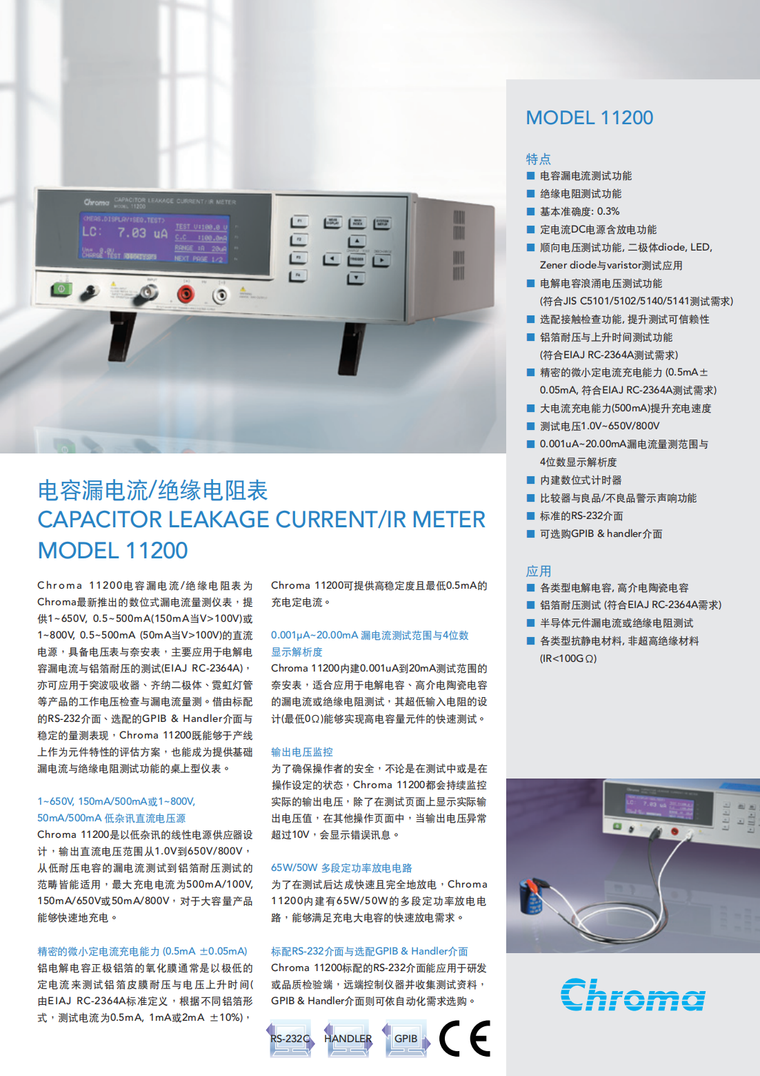 Chroma 11200电容漏电流/绝缘电阻表为Chroma最新推出的数位式漏电流量测仪表,提供1~650V,0.5~500mA(150mA当V>100V)或1~800V,0.5~500mA(50mA当V>100V)的直流电源,具备电压表与奈安表,主要应用于电解电容漏电流与铝箔耐压的测试(EIAJ RC-2364A),亦可应用于突波吸收器、齐纳二极体、霓虹灯管等产品的工作电压检查与漏电流量测。